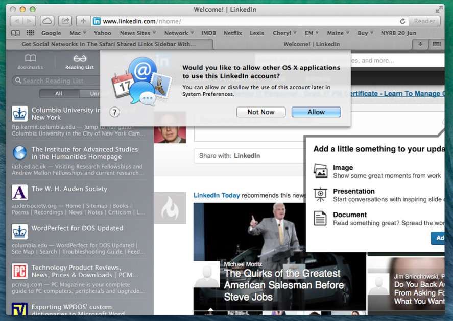 Social-networking addicts get shared links from your LinkedIn connections and people you follow on Twitter, with a button to retweet a link when you see it in the sidebar. An under-the-hood improvement makes Safari run each open page in a separate process, so a slow download on one page won’t slow down everything else. This was a major annoyance in older Safari versions, but it’s now gone.