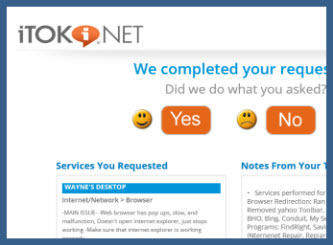 I got a call within three minutes and found myself speaking with David. The way these services usually work is that you first talk with a rep who does a basic analysis of your computer and then hands you off to someone more expert for repairs. David noted that I could either have the problems fixed by an on-site tech or over the Internet. iTOK staff have two remote-control options at their disposal: LogMeIn Rescue and Bomgar—both excellent systems that allow the operator to regain control of a PC even after a reboot.