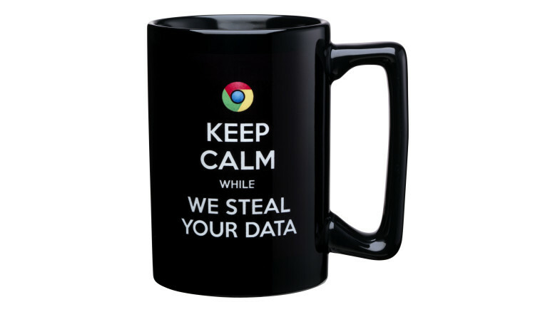 “Keep Calm While We Steal Your Data,” reads the tagline on a $7.99 black mug (above) and $11.99 t-shirt, both of which are currently sold out.