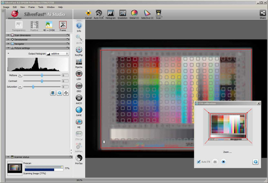 The most notable addition in SilverFast is a color-calibration feature using a standard IT8 calibration target, which you’ll have to buy separately. Calibrating is supremely easy. Put the target in the scanner, click on the color calibration tool, and wait a moment for it to scan and calibrate. That’s all it takes to get scans with better color fidelity.