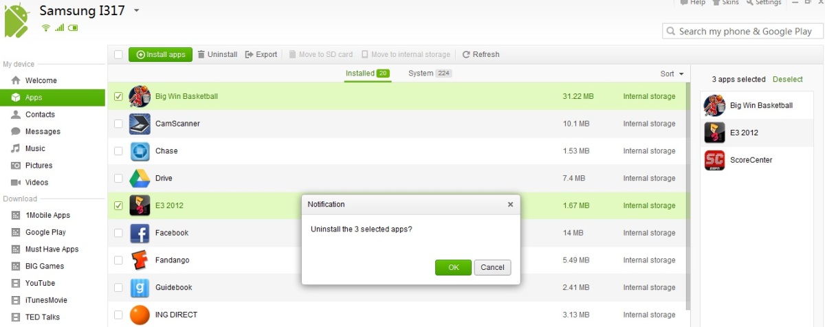 My Devices is where you manage content and, thankfully, the interface is clean and intuitive. Clicking Apps, for example, lets you move software from internal storage to a SD card (and vice versa), export Android apps to your computer, import Android apps, delete apps, and install apps from Google Play. You can perform similar functions with Contacts, Music, Video, Pictures, and Messages content, but each category has its own unique features.