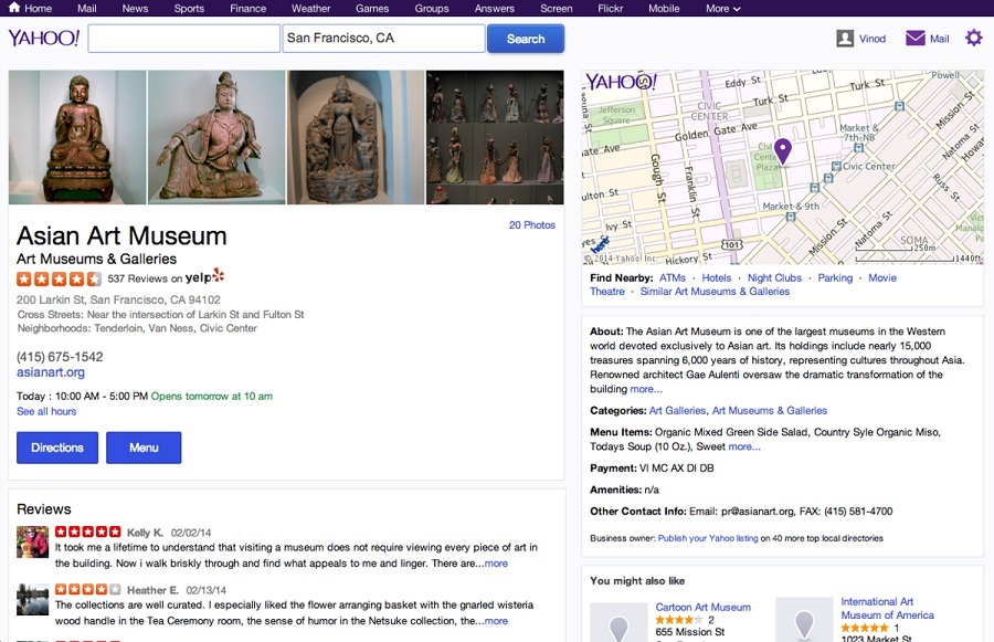 “At Yahoo, we’re always looking to build great partnerships to provide a richer experience for our users. That’s why we’re especially fired up to add trusted user content from Yelp, bringing more business listings, more photos, and more reviews to the recently refreshed Local Search and Yahoo Maps experiences,” Anand Chandrasekaran, senior director of product management, wrote in a separate blog post(Opens in a new window).